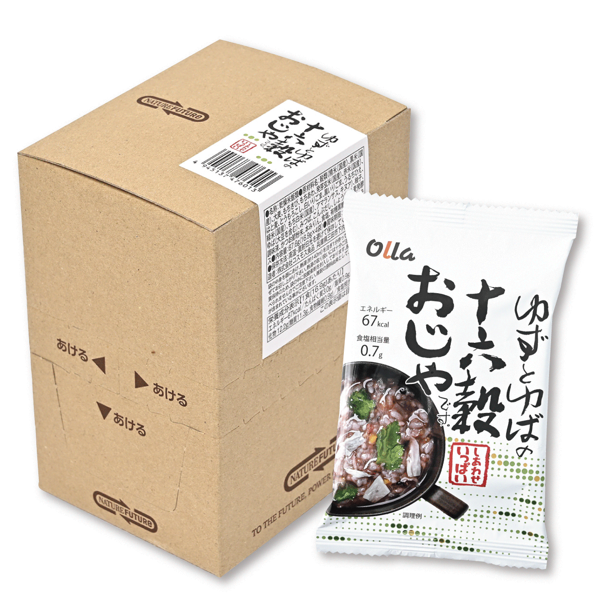16種類の穀物に国産ゆば・柚子皮・三つ葉を合わせ、ふっくら炊き上げました。家庭ではなかなか作れない、柚子の香りが広がる体にやさしいおじやです。