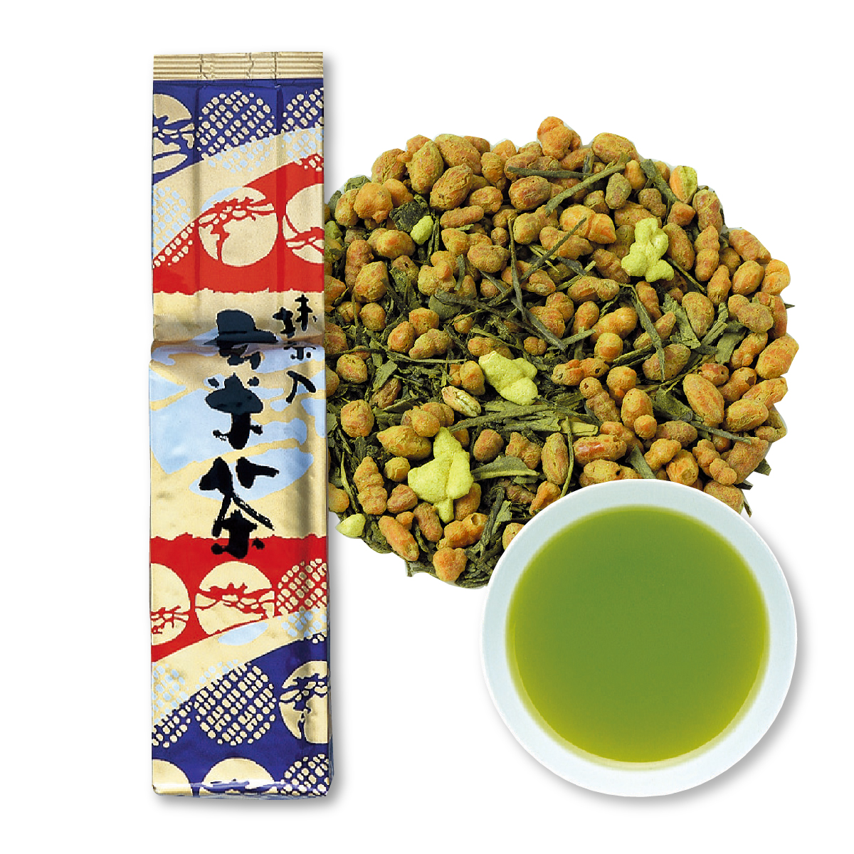 上質な餅米玄米のいりたてを深蒸し煎茶に混ぜました。玄米の香ばしさと深蒸し煎茶の甘みが絶妙な味わいです。宇治の高級抹茶をブレンドした人気のお茶です。