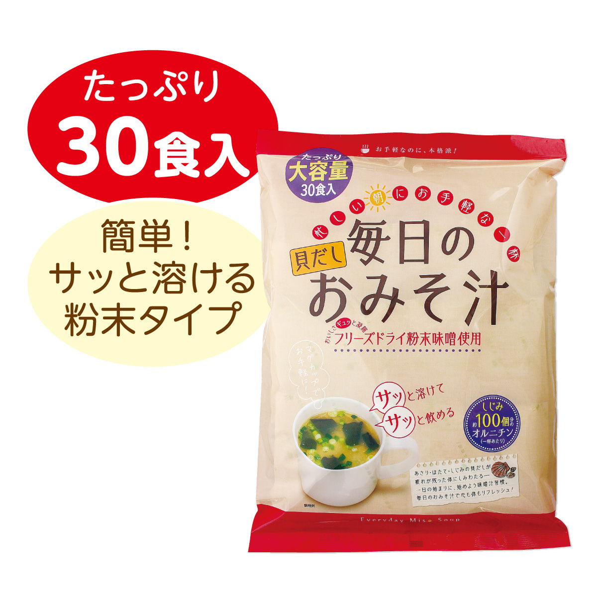 あさり、ほたて、しじみの貝のうま味が体にしみわたります。一杯あたりしじみ約100個分のオルニチンを配合。朝の一杯として特におすすめです。
