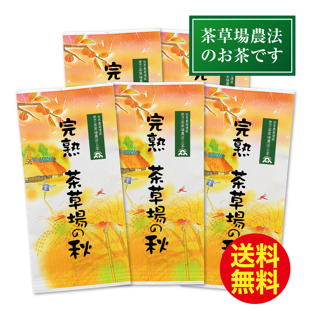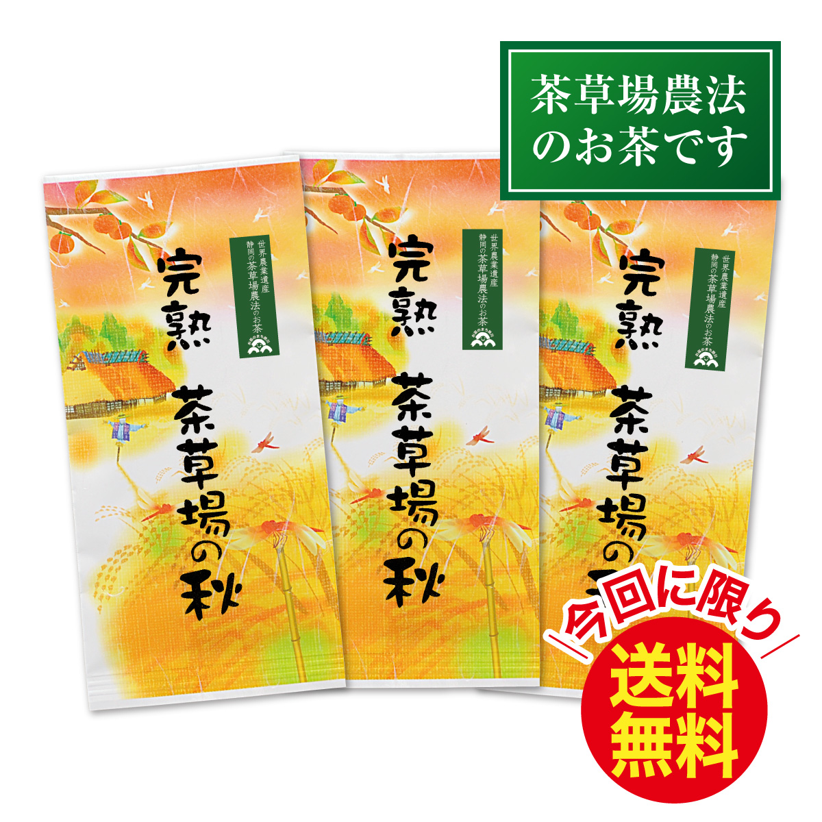 「茶草場農法」で栽培されたお茶を、荒茶のまま低温冷蔵庫で保存し、秋に「蔵出し新茶」として仕上げたお茶です。手間暇をかけて大切に育てたお茶だからこそ、秋になって深みが増します。新茶の新鮮さはそのままに、熟成して深くまろやかになった蔵出し新茶『完熟 茶草場の秋』を是非ご賞味くださいませ。