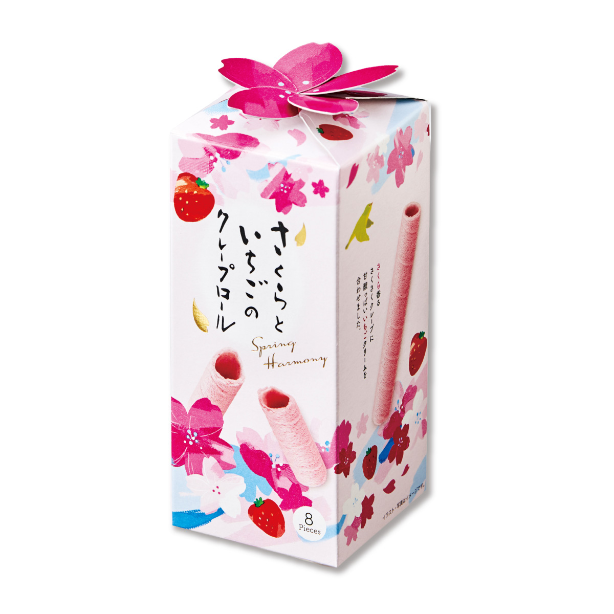 さくさく軽やかなクレープに、ほんのり桜といちごが香るクリームを合わせました。甘さ控えめで、いちごの風味がやさしく広がる春限定のお菓子です。